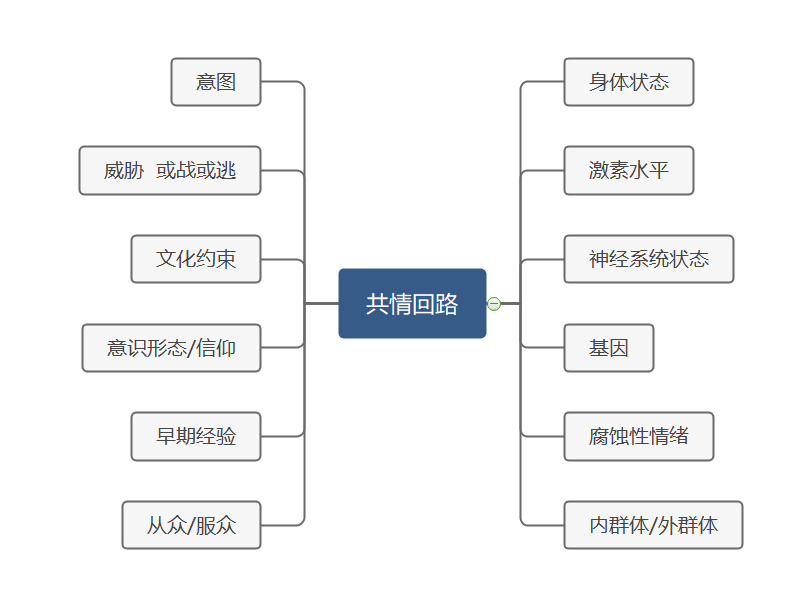 写到这里,终于可以将不同的线索归拢起来,以阐明本书的主要观点:人之所以做出残酷行为,是因为共情回路出了故障。下图展示了一些列因素影响、破坏共情回路的功能,它也清楚地展示了共情回路的中心地位。