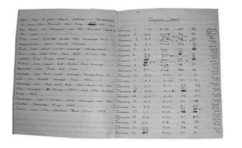 有意思的是,社交世界对阿斯伯格综合征患者来说似乎并无规律可循,他们对社交场合感到困惑与之相比,教堂钟声的世界是高度规律的。这里要提到一个在我看来很好玩的人,他叫凯文。他最幸福的事情就是半夜走进自家的花园,专心致志地观察自然界和他(用来记录气象)的设备。每天夜里他都在笔记本上记录预测结果,包括当天的日期、温度、降水和风速。他有几百本这样的笔记本,记载了数千条微小的信息模式。凯文对气象的系统化是为了能预测天气(至少在自己的花园里)。下图是他的某本笔记本中一页的复印件:
