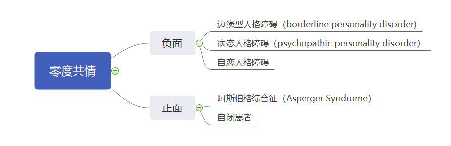 零度共情有负面类型(zero-negative)和正面类型,根据不同表现和成因,负面类型可分为边缘型人格障碍(borderline personality disorder)、病态人格障碍(psychopathic personality disorder)、自恋人格障碍,可以看到负面类型都属于人格障碍;正面类型有阿斯伯格综合征(Asperger Syndrome)与自闭患者,其实阿斯伯格综合征与自闭症无法严格区分。